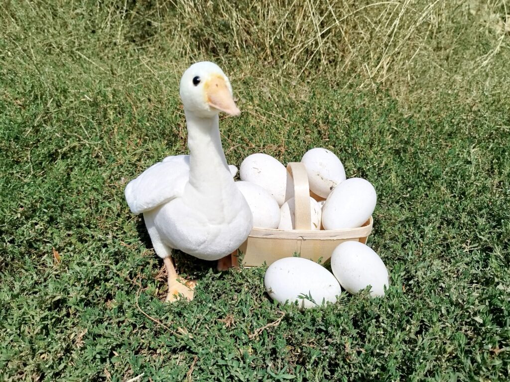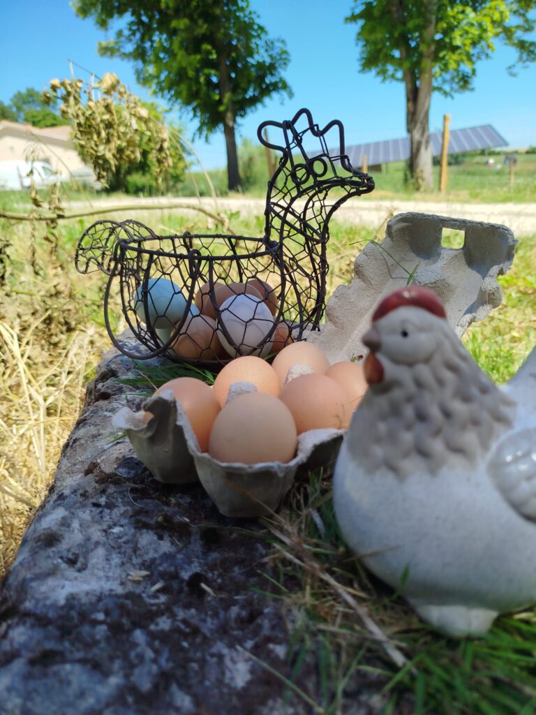 Depuis 2024, nos poules pondeuses élevées en plein air nous permettent de proposer des oeufs vendus directement sur les marchés. Nous sommes également éleveurs d’oies, avec la vente d’oies et d’oeufs d’oie en saison.